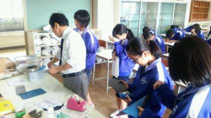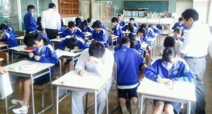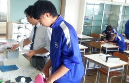 写真は、2校時の3年3組の美術の授業の様子です。中村忠男先生と江原正先生とのTTの授業です。生徒の質問にすぐに対応していました。生徒たちもまじめに作業に取り組んでいました。