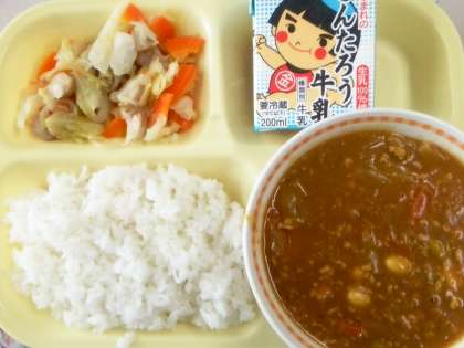 今日の給食のメニューは、豆と挽肉のカレー、キャベツとウインナーのソテー、ご飯、牛乳です。