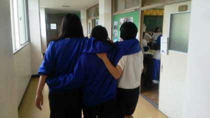 写真(下)は、1組の教室に戻る途中のいつも明るい3人組の後ろ姿です。