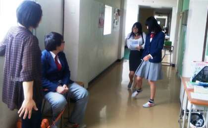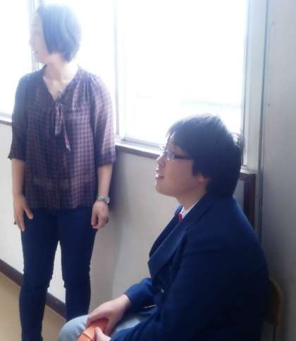 写真(下)は、待ち時間にかつて担任(もしくは部活顧問?)をしたお兄ちゃんのことをお母さんと笑顔で談笑しているところです。