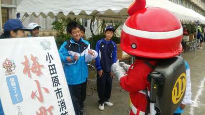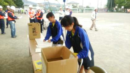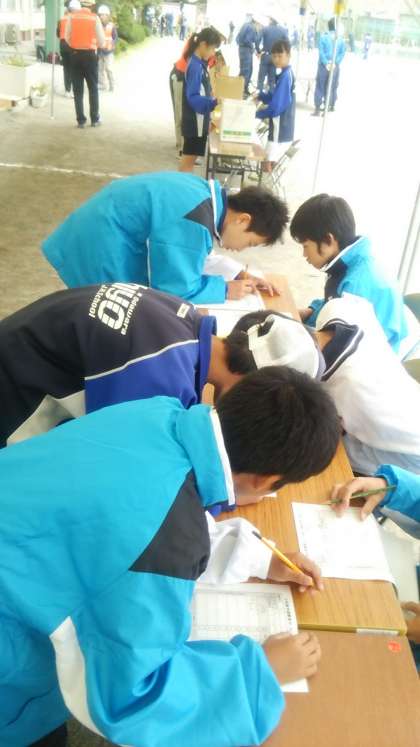 今日は、小田原市内一斉に行われる防災訓練の日です。一斉を「いっせい」と敢えてひらがな表記をするところがおもしろいです。千代中学校では午前中の部活動は中止(秋の新人大会など公式戦には参加)し、千代中学校区の4つの地区の防災訓練に、中学生も参加できる体制を作りました。写真は、千代小学校のグラウンドで行われた上府中地区の防災訓練です。男女ソフトテニス部員が参加してくれました。