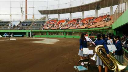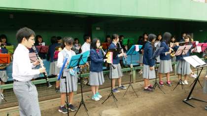 小田原球場で行われた第22回TRY bank Sagami少年野球大会の開会式の演奏を千代中吹奏楽部が行いました。