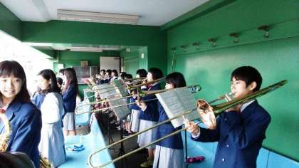 早朝の本番はなかなか楽器が温まらず、手首が動かず、ウォーミングアップがとても大切です。金管のメンバーはカッコいい「ファンファーレ」の演奏もあってドキドキです。