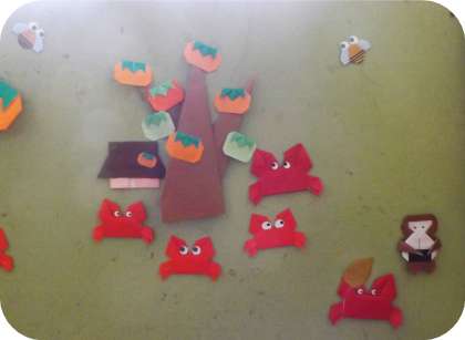 カニとサル、おにぎりと柿の実、おなじみのサル・カニ合戦の場面が折り紙で表されています。柿を投げつけられたカニの仕返しにウスが飛びかかり、ハチがチクリと刺します。折り紙たちが表情豊かに階段の踊り場で、物語を演じてくれています。