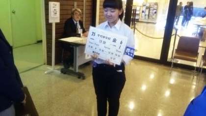 写真(中)は、発表直前のステージ袖口に向かうところです。みないい笑顔です。
