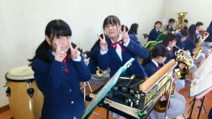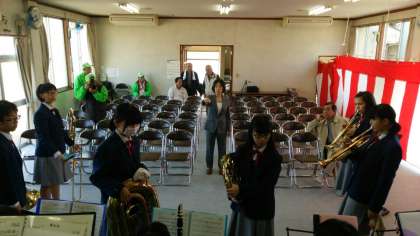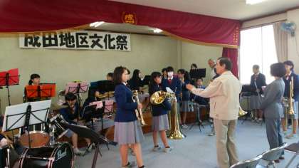 成田公民館での文化祭に吹奏楽部が出演しました。写真は、その演奏準備風景です。今日は、会場が大きくないので『フルート五重奏』と『金管六重奏』の少人数で参加しました。