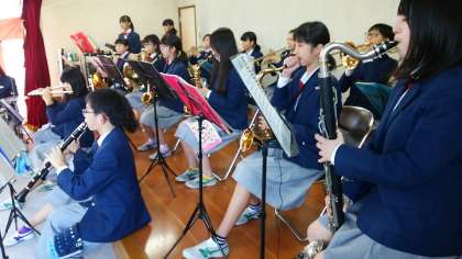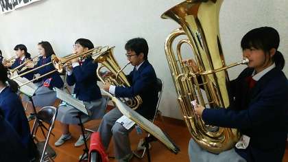 写真(上)は、成田在住の栢沼行雄教育長さんと吹奏楽部顧問の新妻和音先生です。