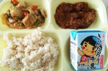 今日の給食のメニューは、豚肉の生姜醤油揚げ、がんもどきの煮物、さくら飯、牛乳です。