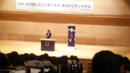 夜の“とある大学”(体育科の遠藤修平先生の母校、教育指導課の市川嘉裕課長さんも母校)での研修会に来ました。将来指導者になる学生たちへ、部活動での顧問による理不尽な指導(言い換えれば『いじめ以外のなにものでもない』)で命を落とした子どものお母さんの体験談は、涙なしには聞くことができませんでした。『部活動を私物化し、自分の思い通りに動かなければ罵倒し…』という具体例は、学生たちの心に響いていたようで、たくさんの学生が私と同じように涙しながら聞いていました。