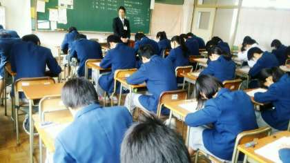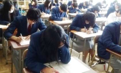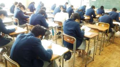 千代中では、水曜日から3年生の第3回定期テストが行われていて、今日はその最終日です。写真は、1校時の英語のテスト風景ですが、みなとても真剣です。この定期テストが終わるとすぐに各教科の「評価・評定」が出されます。これが進路に関係する3年生の内申の点数となります。内申点がいくら良くても、学力検査でその力を発揮できないと公立高校は不合格となる可能性もあり、3年生にとってはこれからも不安は尽きません。「がんばれ3年生!!」