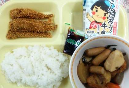 今日の給食のメニューは、鰯のカリカリフライ、洋風おでん、ご飯、海苔の佃煮、牛乳です。