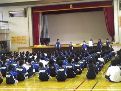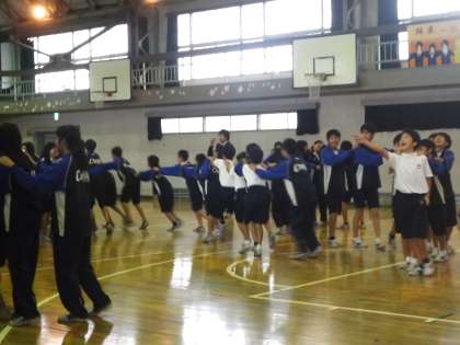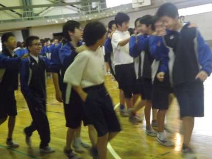 3年生は定期テスト、2年生は職場体験、1年生は授業と今日は学年によって内容がバラバラでした。午前中授業を頑張ったご褒美と言うわけではありませんが、5校時は学年委員会主催の学年レクを行いました。天気が良ければ学年全員でグラウンドをつかってドロケイの予定でしたが、雨でグラウンドがぬかるんでいたので体育館での実施となりました。まず、最初はジャンケン列車、体育館一杯に列がつながって、誰が先頭で誰が最後尾か分からない状態になってしまいました。