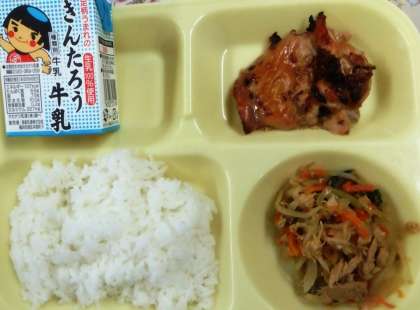 今日の給食のメニューは、鶏肉の辛味焼き、青菜とツナの炒め物、ご飯、牛乳です。