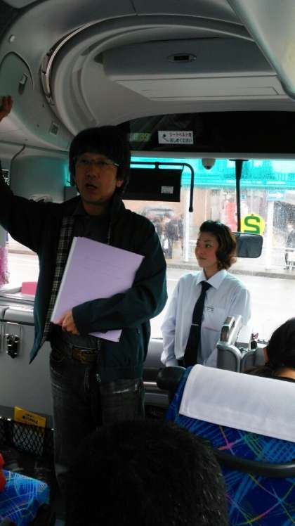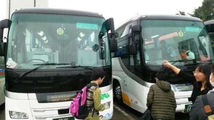 写真(中)(下)はバスに乗ったところです。千代中学校のバスは2号車で、運転手さんは女性ドライバーです。カッコいいです!