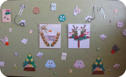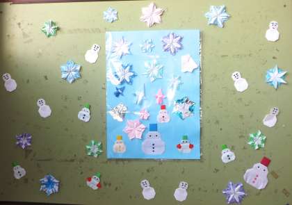 冬休みの最後に折り紙ボランティアの皆さんが、1月バージョンの折り紙を飾ってくださいました。くま手やお餅、門松等々、お正月らしい折り紙と雪だるまが一杯の新春の折り紙が冬休み明けの生徒たちを迎えてくれました。