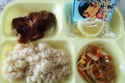 豚肉を使った給食のメニューは多彩です。今までも、“香り揚げ”、“味噌炒め”、“生姜焼き”、“照り焼き”、“味噌漬け焼き”、“スペアリブ”、“ジンギスカン焼き”、“生姜醤油揚げ”、“アップルソースがけ”、“豚肉丼”などがありました。今日は“ジンギスカン揚げ”で、“鶏の唐揚げ”のようにカリッと揚がっていました。