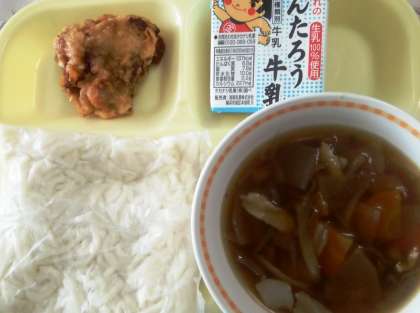 今日の給食のメニューは、けんちんうどん、とり天、牛乳です。