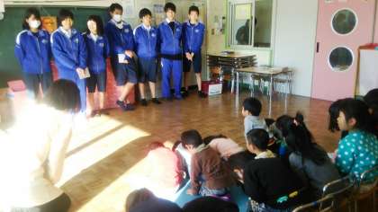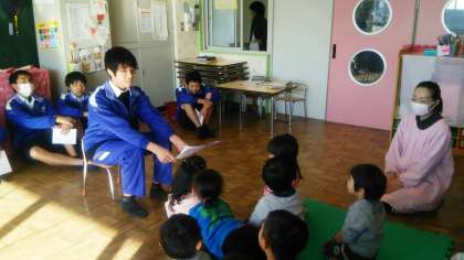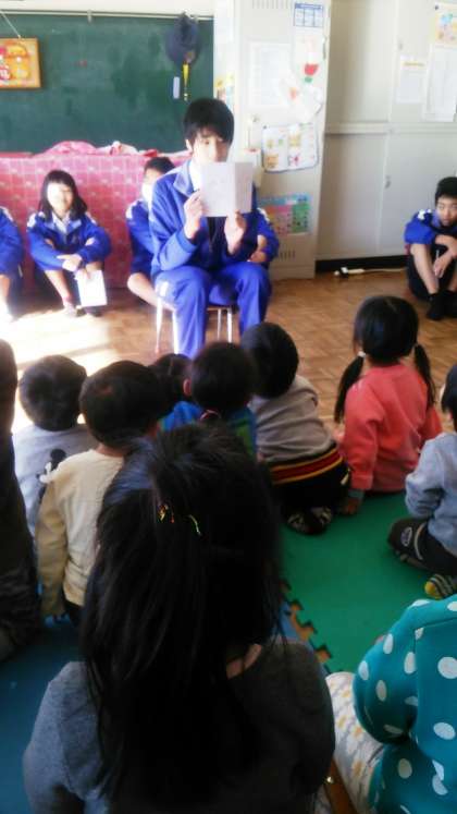 今日の2校時は、3年4組の家庭科の授業で上府中保育園での「保育交流」を行いました。いままでに何度も上府中保育園にうかがっているので、保育園の子どもたちと中学生たちはとてもいい感じでほんわかした雰囲気でした。今日は園児たちに“読み聞かせ”を行いました。園児たちと一緒にいる中学生を見ると、とても大きく見えるのが不思議です。
