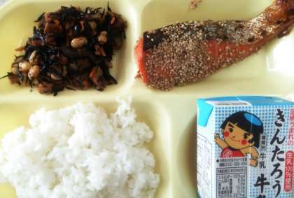 今日の給食のメニューは、鮭の利休焼き、大豆の磯煮、ご飯、牛乳です。