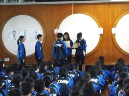 1年生は1校時に学年集会を行いました。最初に先週行ったカルタ大会の表彰を行いました。続いて、学年主任の生月先生のお話し、続いて学年委員会からの目標の発表、日渡先生から今後の学校生活についてのお話しがありました。どの話の中にも新しい年を迎え気持ちを新たにし、2年生に向けてこれまでよりも成長出来るようしっかりとやって行きましょうという内容でした。1年生も残り2ヶ月と半分、4月に頼れる先輩として、新入生を迎えることができるように、頑張りましょう。