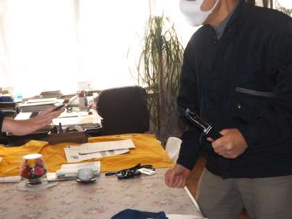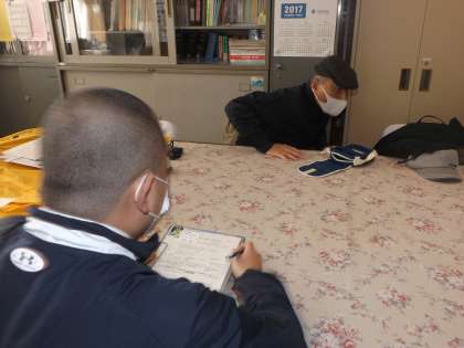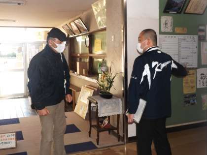 不審者対応の防犯訓練を行いました。「千代中生に笑われた」と怒鳴り込んできた人に美本先生が対応します。校長先生が不在のため、美本先生が落ち着かせようと話を聞きます。怒りがおさまらない男性は、突然ナイフを出し校長室を飛び出そうとします。
