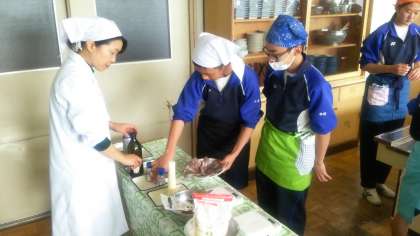 生徒たちはみなカラフルなエプロンを着けていますが、これは1年生の家庭科の授業で作ったものです。これを着用しないと調理実習はできないシステムになっているそうです。写真(上)左、白衣を着ているのが家庭科で2年学年主任の小野寺敏子先生です。