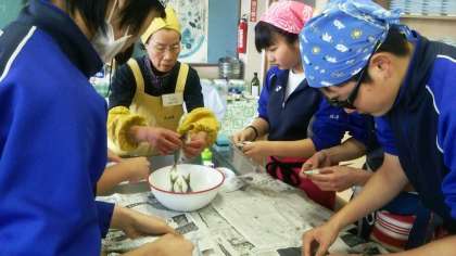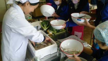 調理実習2日目は、2年2組です。今日も地域の「六彩会」の方々6名にお越しいただき、鰺の開き方を中心に生徒たちに丁寧に教えていただきました。