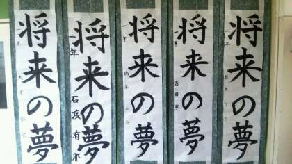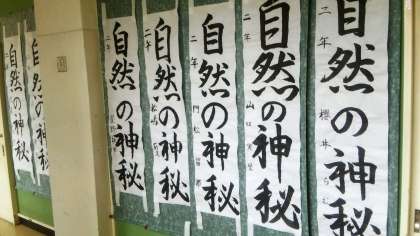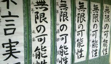 技術科室前の廊下に、書き初めの各学年から選ばれた優秀作品が掲示されています。どれもとても上手です。写真(下)の3年生の「無限の可能性」は、成人式の式典で加藤憲一市長さんが、3度も言った言葉でした。中学生にも「無限の可能性」があります。私もこの言葉にあやかりたいです。