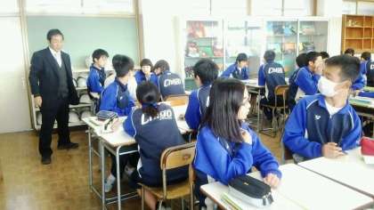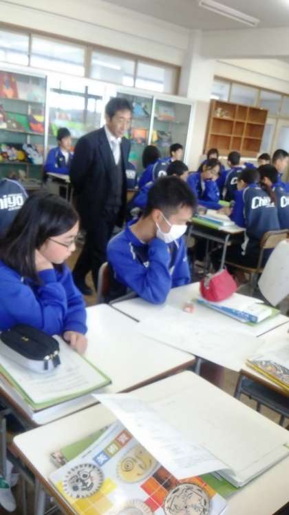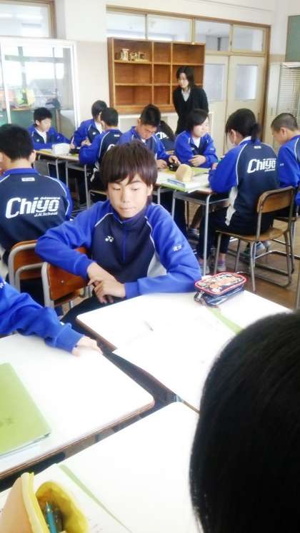 写真(下)は、担任の西山佳代子先生も授業を見に来てくれたところです。