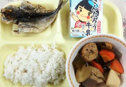 今日の給食のメニューは、「小田原献立」ということで、鰺のカリカリ揚げ、おだわらっ子おでん、麦ご飯、牛乳です。
