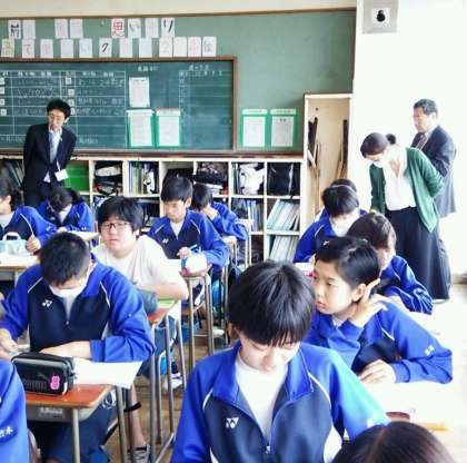 写真は、2年4組の国語の授業風景です。授業者は渡辺香澄先生です。この授業には、家庭科の高木清司先生と拠点校指導員の三木宏先生も参観していました。