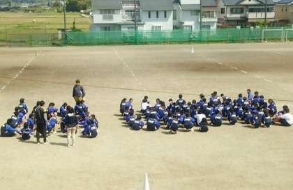 写真は、グラウンドでの体育の授業風景です。1年2,3,4組で、授業者は石井豪先生と日渡雄太先生です。