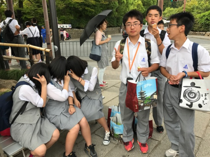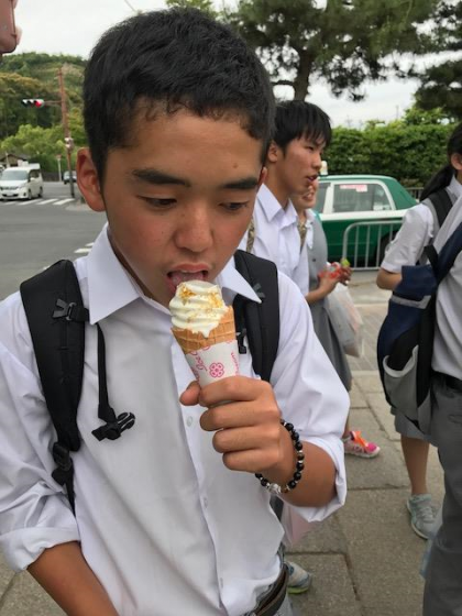 金閣寺には多くの班が訪れました。同行のカメラマンさんも金閣寺に一日中いてくれたそうです。金閣寺らしい「金箔ソフトクリーム」がとても美味しそうです。