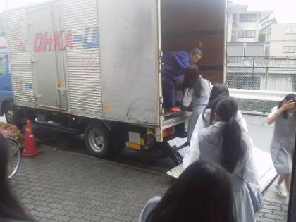7時45分:荷物の積み込みが始まりました。着替えやお土産のほか、たくさんの思い出がつまったカバンをトラックに運んでいます。