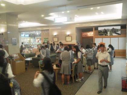 8時10分:本日の京都は、朝からあいにくの雨になってしまいました。今日は、クラスごとにバス移動です。出発までのひとときをロビーでくつろいでいました。