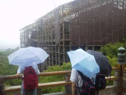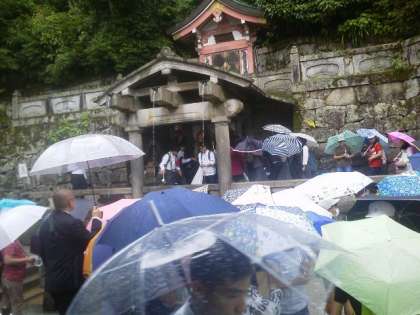 音羽の滝は長蛇の列。順番待ちも楽じゃないですね。こちらは傘の花が咲いていました。