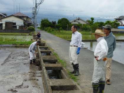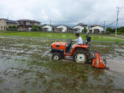 明日の1年生の「田植え体験」に備えて、上府中まちづくり委員会の方々が「代掻き作業」をしていただきました。