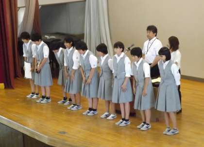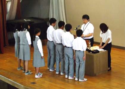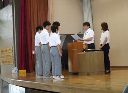 第1回定期テストが終わって、気持ちもホッと一息ついた4時間目、1期の表彰集会が行われました。4月からの大会で受賞した各部が全校の前で紹介されました。男子ソフトテニス部、剣道部、陸上競技部、女子バスケットボール部…、どの部もいい笑顔で賞状を受けとっていました。