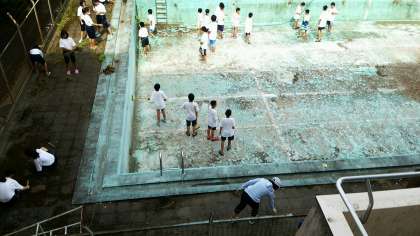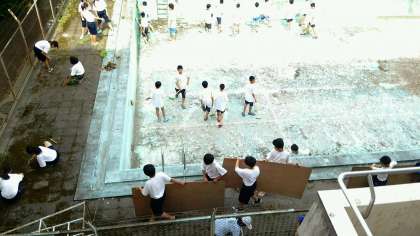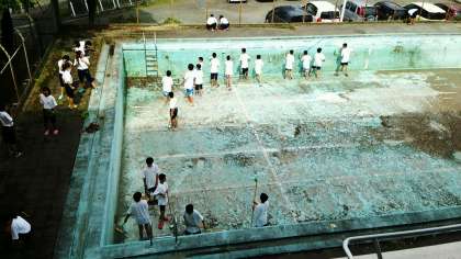 写真は、プール清掃の様子です。1年ぶりにプールの底が見えました。