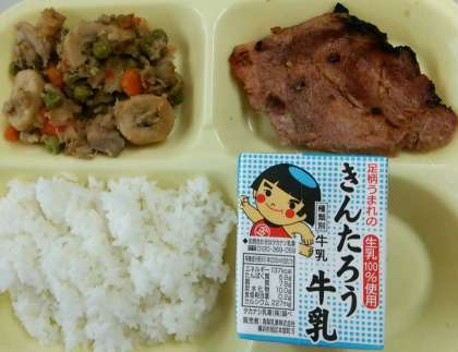 今日の給食のメニューは、豚肉のスペアリブ、筑前煮、ご飯、牛乳です。