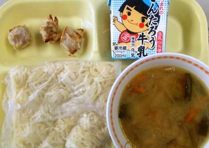 今日の給食のメニューは、味噌ラーメン、焼き焼売、牛乳です。