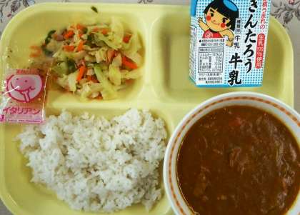 今日の給食のメニューは、ポークカレーライス、温野菜サラダ、牛乳です。