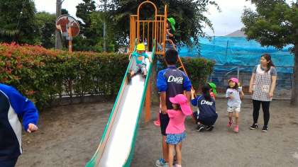 写真中:すべり台も、順序を守る、という「社会的生活習慣」を身に付けるよい機会ですね。