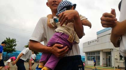 写真上:泣いちゃった子をあやしています。この後保育士さんに変わってもらったら途端に泣き止みました。さすが!