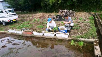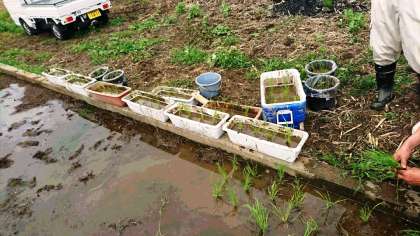 写真は、生育の良くなかった千代中プランターの稲苗の「植え替え作業」の様子です。昨日プランターの土を入れ替え、1日寝かせ、先ほど苗を植えていただいたところの写真を、沖山連合自治会長さんを経由して飯倉さんよりいただきました。いつもありがとうございます。