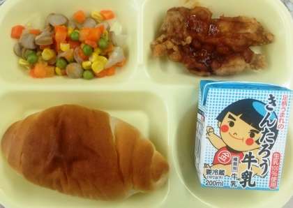 今日の給食のメニューは、鶏肉のオーロラソースがけ、新玉葱とウィンナーのソテー、ロールパン、牛乳です。