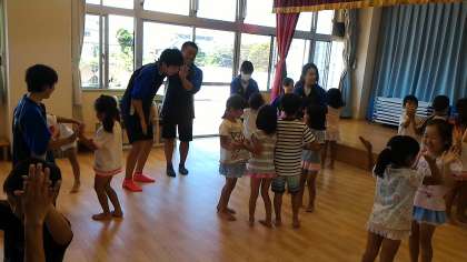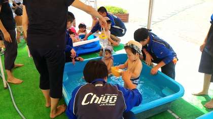 写真上:ビニールプール周りで幼児とふれあい・観察です。すぐひざをついて接していてよかったです。