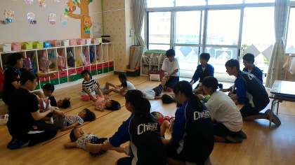 写真中:楽しそうにふれあい体験していますが、中学生同士より、幼児と遊べるといいですね。後半は大丈夫かな。