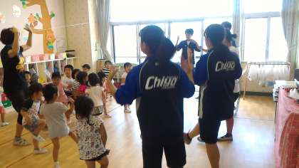 写真上:お遊戯は一緒に幼児と混ざってできるといいですけど、振り付けもあり、難しいですね。がんばって踊っているので写真がぶれています。