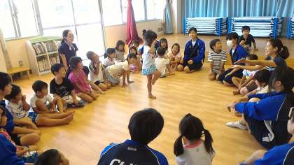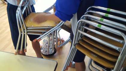 写真中:いすを出すのを手伝っていますが、すぐ近くに幼児が座ってしまっています。周りの状況認識がまだまだできないので、ふれあい体験では特に注意を払うべきところです。無事にできました。